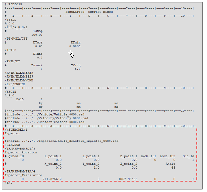 - インパクターのインクルードファイルは//SUBMODEL内で定義され、/TRANSFORMカードはインパクターサブモデルを参照して自動的に生成されます。