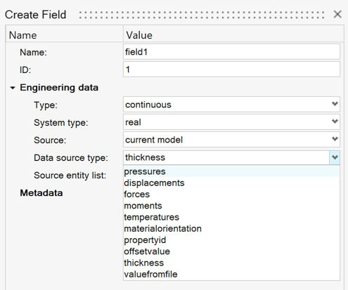 Fields can be based on a variety of sources, including collections of entities or values already in the model, those in a different version of the model, results from a different type of model, or simply from a .csv file containing locations and values. In realizing a field, a selection of algorithms is available to map the field to the current mesh to create a variety of loads and other entities.