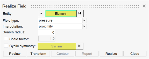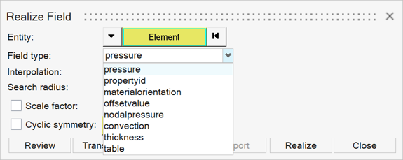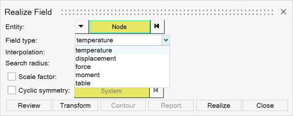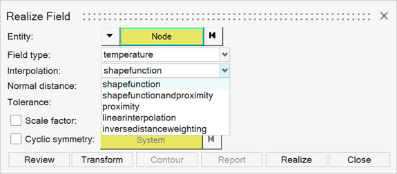 Depending on the field source data and whether the target is nodes or elements, different realization types are available to choose.