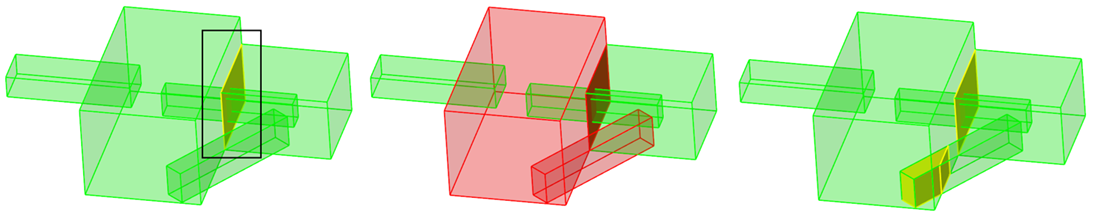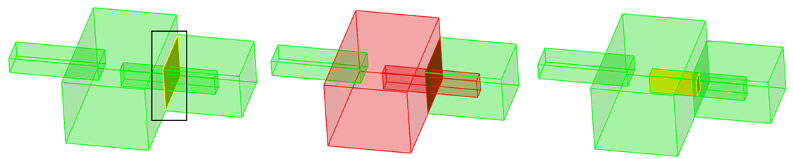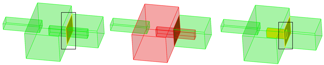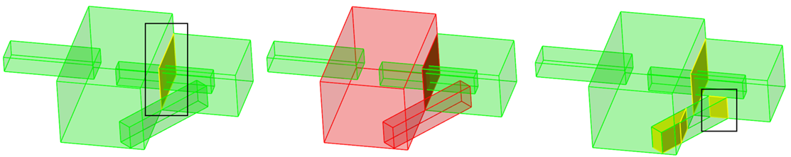 以下の例では、選択されたソリッドは、選択されていない別のソリッドと共通のインタフェースを有します。パラソリッドオプションを使用した場合、そのソリッドは考慮されておらず、これらのソリッドを切り離すことによって共通面が除去されます。従来のジオメトリ エンジンでは、選択されていないソリッドと面を共有するソリッドは、ブーリアン操作でも考慮されます。図 5. パラソリッドオプションを使用した結合