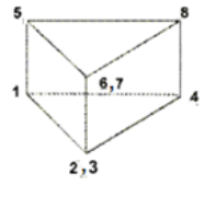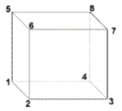 縮退六面体要素は、Hex8またはHex20要素が縮退されてウェッジ要素(Penta6またはPet15)になったものです。Penta6(要素コンフィギュレーション206)は、6節点が図 1に示す順序の3Dの1次三角形プリズム形状要素です。Hex8(要素コンフィギュレーション208)は、8節点が図 2に示す順序の3Dの1次三角形ブロック形状要素です。縮退六面体(要素コンフィギュレーション206)オプションは、8節点が図 3に示す順序の3Dの1次三角形プリズム形状要素です。