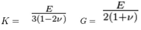ここで、E はヤング率、ρは材料密度、𝜐 はポアソン比、K は体積弾性率、G はせん断弾性率を表します。