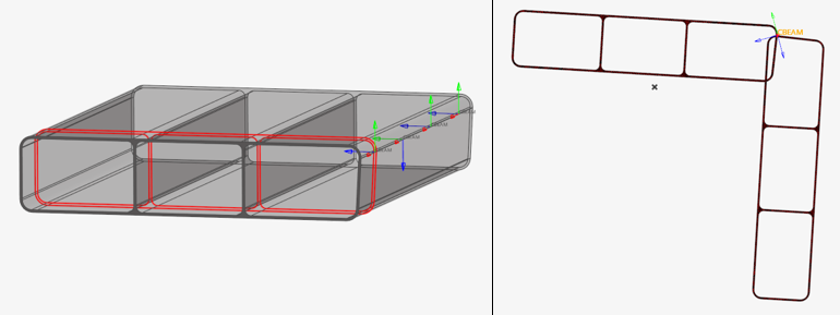 状況によっては、ソースと交差する有限平面を考慮することが推奨されます。図 5では、無限平面(デフォルト)を使用することで、トリミング時に望ましくない領域が考慮されます。このような場合は、有限平面に切り替えて、断面の幅と高さを定義できます。ただし、位置ごとにサイズを定義することはできません。幅と高さはすべての交差で共通となります。