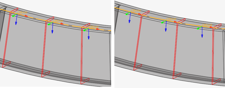 - ターゲット要素の各節点位置で断面が計算されます。隣接する要素のX軸同士が成す頂角が角度トレランスのしきい値を下回っている場合は、共有節点に対してシングル断面が計算され、下回っていない場合は、異なる法線を使用して同じ節点で要素ごとに1つの断面が計算されます。Y、Z軸に関する隣接要素からの逸脱の追加のテストは行われません。プロパティは、2つのビーム断面(それぞれの端点に1つずつ)で作成されます。節点でシングル断面が作成された場合、隣接する2つのプロパティは、それらの端点で同じビーム断面を共有します。
