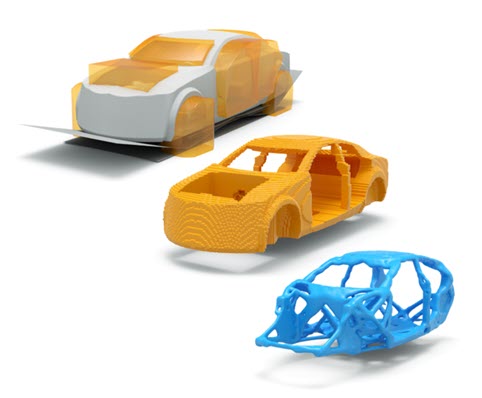 下の画像は設計空間のプロセスで、1番上のモデルはエンベロープがオレンジ色の透明なボリュームとして表示されています。これらのエンベロープボリュームは、ボクセル設計空間が作成される際に除外されます(中央の画像参照)。図 1.