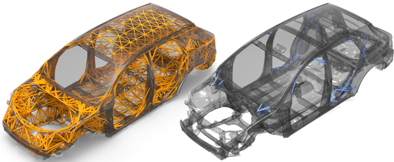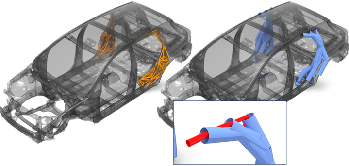 - この例では、設計空間の位置はわかっていますが(オレンジ色の1D要素)、補強構成の詳細は不明です。右側の図(青色の要素)は、サイズ最適化の結果です。影響をほとんどまたはまったく及ぼさないビーム要素はすべて手動で削除されます。残りの要素によって、必要な設計指針が提供されます。この場合、この設計指針によって、そのローカルな領域で最大のフットプリントを与える1D要素が保持され、(質量を低減するため)壁厚を最小に抑えながら直径が最大化されます。結果は最適化問題の定義に応じて異なります。