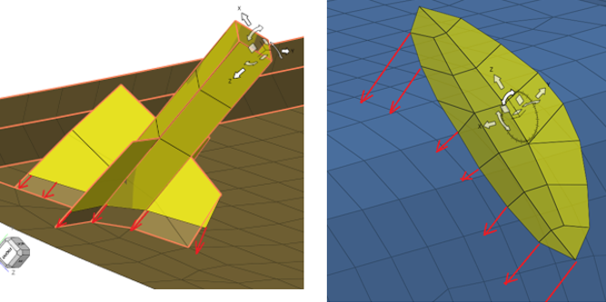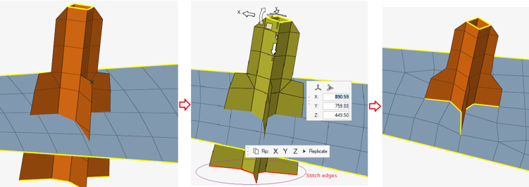 - この機能は、フィーチャーをベースメッシュまで延長する処理またはそこまでトリミングする処理で効果的です。その使用方法を示した下のサンプル画像をご参照ください。処理は左の図から右の図へ進みます。注: この例では、フィーチャーを使用してベースメッシュをトリミングし、ベース上に等角のフィーチャーエッジ(右端の画像を参照)を作成するためにコピーオプションをオフにしています。