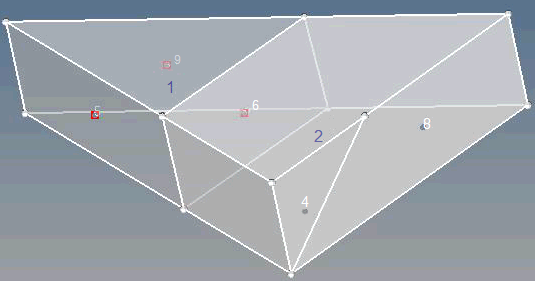 図 1では、両方のソリッドは個々にマップ-メッシュ可能ですが、ソリッド1(三角形)のマークされたすべてのフェイス(5、6、9)はマップ-メッシュでなければなりません(現在はマップ-メッシュではない)。しかし、ソリッド2においては、共有サーフェス(6)をマップする方向のターゲットとして使用した場合にのみマップ-メッシュが可能となり、矛盾の原因となります。つまり、この共有サーフェスが、ソリッド2のメッシュのためにサーフェス4と8上のメッシュと一致しなければならないので、矛盾が生じます。