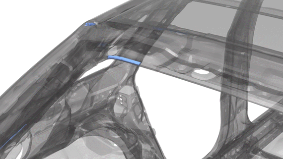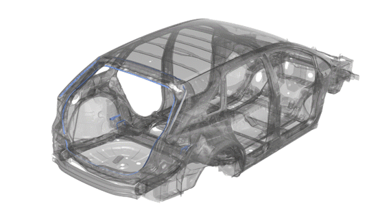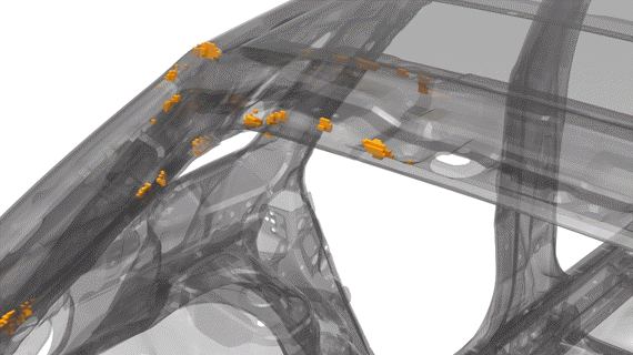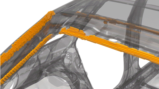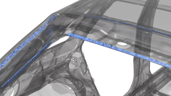 図 1 は、剛性を高めるために構造用接着剤が使用されたサンプルの自動車モデルを示していますが、接合長さは最適化されていません。 図 2 は、このページで説明しているプロセスに従って接合設計空間に変換されている元の接合を示しています。 図 3 と図 4は、それぞれ最適化の前と後の構造用接着剤を示しています。最適化されたモデルでは、パフォーマンス上の利点は同等ですが、接着剤の量が大幅に節約されます。