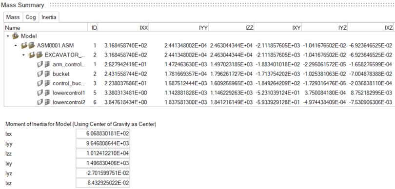 Massツールを使用して、モデルの質量、重心(COG)、慣性モーメント(MOI)を計算します。