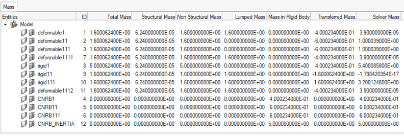 - Mass in Rigid Body列の合計値であり、モデル内の節点剛体要素の合計質量を表します。