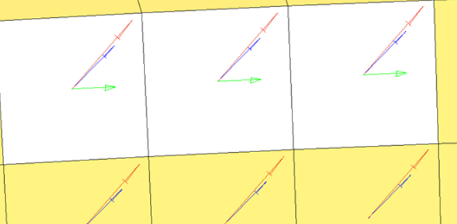 6. . 緑色の矢印は材料軸X方向を示します。青色の矢印は、ドレープなしのプライ5の繊維方向を示します。赤色の矢印は、ドレープありのプライ5の繊維方向を示します。