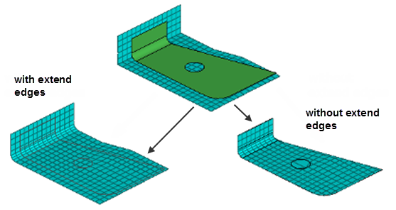 サーフェスまたはメッシュのエッジを、そのサーフェスまたはメッシュ上で最も近いポイントにおける法線と直交する方向に引き伸ばします。このオプションが選択されている場合は、移動節点がサーフェスまたはメッシュの拡張表現上に投影され、節点をサーフェスまたはメッシュのエッジを超えて投影できるほか、任意の穴の中へも投影できます。このオプションが選択されていない場合は、移動節点がサーフェスまたはメッシュの内部またはエッジに投影されるため、モーフィング後のメッシュが歪む可能性があります。
