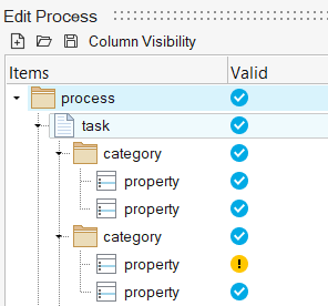 - プロセス、タスク、カテゴリ、またはプロパティについて、挿入された属性が正しいのか、あるいはさらに編集する必要があるのかを確認します。感嘆符は、属性を修正する必要があることを示します。