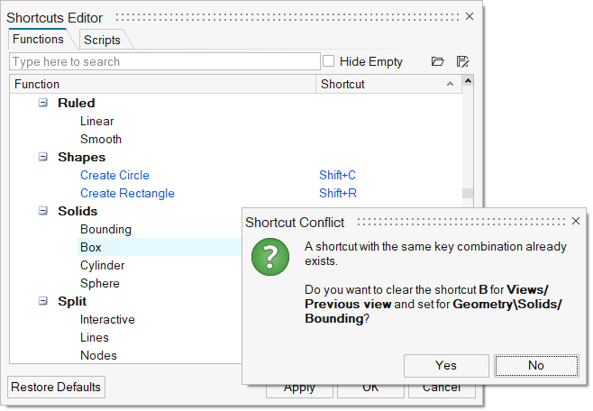 Functionsブには、ショートカットの割り当てに使用できるツールのツリー構造が表示されます。Hide Emptyチェックボックスをオンにすると、現在ショートカットが割り当てられている機能のみが表示されます。