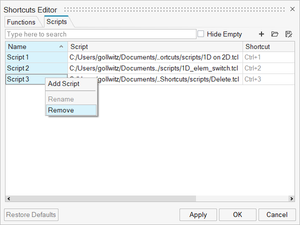 をクリックして、ユーザーが作成したPythonまたはTCLスクリプトを登録できます。スクリプトを右クリックして名前を変更します。