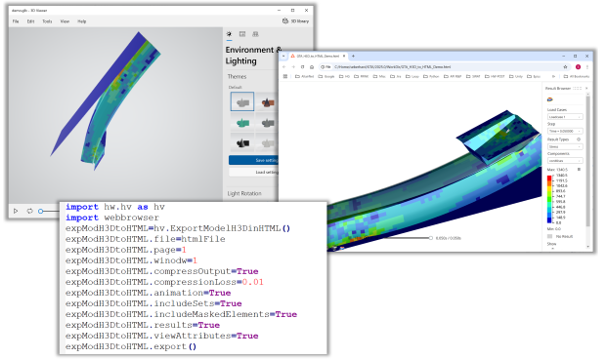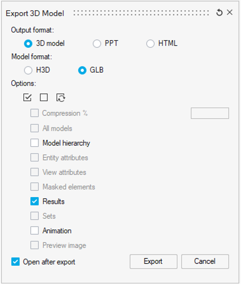 - PythonのクラスExportModelGLBinPPT()、ExportModelH3DinPPT()、ExportModelH3DinHTML()、およびExportModelGLB()は、HyperViewからの3Dモデルのエクスポートをサポートしています。Export 3D Modelのグラフィカルユーザーインターフェースのすべての属性がサポートされています。