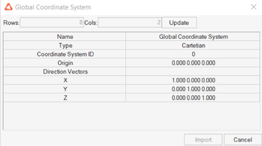 - 実行されると、全体座標系のテーブル出力が生成されます: