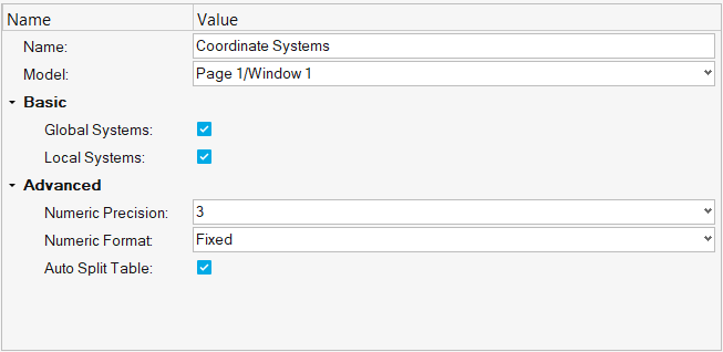 全体座標系とモデル内の局所座標系のテーブル出力を生成します。