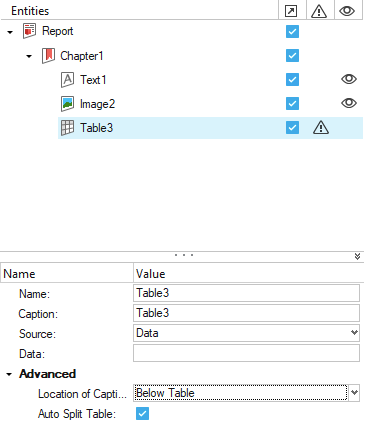 - テーブルエンティティのキャプションを指定します。このキャプションは、エクスポートされたドキュメントレポート内に表示されます。