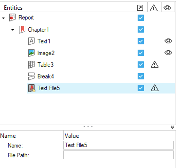 注: テキストファイルエンティティは選択されたテキストファイルからデータをインポートし、それをエクスポートされたレポートに挿入します。インポートされたテキストは、レポート内でデフォルトのフォントが割り当てられます。