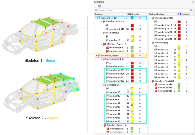 Variants are created by dragging and dropping from the main pane (right) to the secondary (left). Depending on what is selected, the appropriate entities are organized. For example, if a panel is organized to a new skeleton variant, then the members and member joints are organized too. Organizing a member will organize the two joints too.