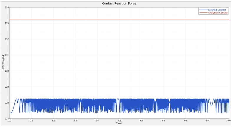 解析的接触では、予測どおりの一定の力が報告されています。対照的に、メッシュ間接触表現では小さめの力が報告されています。さらに、メッシュ間の接触では、三角形が接触したり離れたりするのに合わせて、力が変化しています。より細かいテッセレーションを使用することで力の変動は小さくできますが、これにより、シミュレーションの負荷が増大します。
