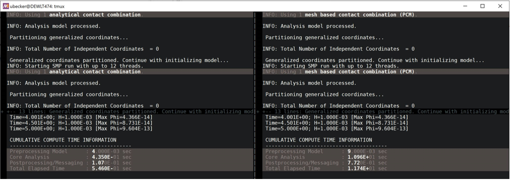 次の図では、解析的接触とメッシュ間接触のパフォーマンスを比較しています。このシンプルなモデルでは、解析的接触(左)はメッシュ間の接触(右)に比べて約21倍高速です。