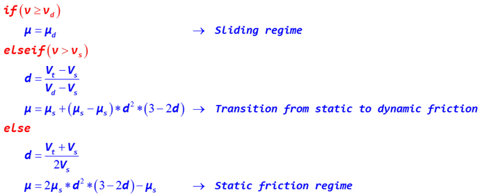 1つ目の手法では、POISSON、IMPACT、VOLUMEの各力モデルについて、接触パッチにおける摩擦力が同じように計算されます。垂直抗力と摩擦係数の積として摩擦力をモデル化するクーロン摩擦則が使用されます。摩擦係数は、滑り速度の関数としてモデル化されます。摩擦力は、以下の式に従って粘性力としてモデル化されます: