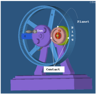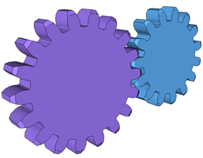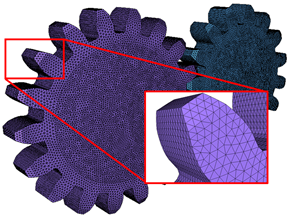 3Dメッシュ表現の使用:剛体のグラフィックスは、三角形要素を使用してメッシュ化する必要があります。弾性体のグラフィックスは、その有限要素メッシュから直接採用されます。メッシュされたグラフィックスは、閉じたソリッドを記述する相互結合された要素のセットです。上記の様子を以下の図に示します。図 6. メッシュを使用した形状の3D表現 - 2つのギアボディの形状表現