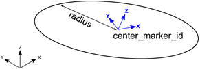 CircleFromRadiusグラフィックタイプは、1つのマーカーと半径で定義されます。円の原点は、center_marker_idで指定されるマーカーの原点に置かれ、このマーカーのZ軸がこの円の平面の垂線を決定します。半径は、radius属性によって指定されます。