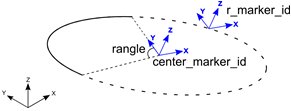 ArcFromRMグラフィックタイプは、2つのマーカーで定義されます。弧の原点は、center_marker_idで指定されるマーカーの原点に設定され、さらにこのマーカーのZ軸がこの円の平面の垂線を決定します。r_marker_idの原点を使用して、円の半径を として特定します。ここで、 はcenter_marker_idの位置、 はr_marker_idの位置です。弧はcenter_marker_idのY軸から、rangleで定義した開き角だけ反時計回りに描かれます。