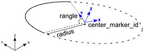 ArcFromRadiusグラフィックタイプは、1つのマーカーと半径で定義されます。弧の原点は、center_marker_idで指定されるマーカーの原点に設定され、さらにこのマーカーのZ軸がこの円の平面の垂線を決定します。半径は、radius属性によって指定されます。弧はcenter_marker_idのY軸から、rangleで定義した開き角だけ反時計回りに描かれます。