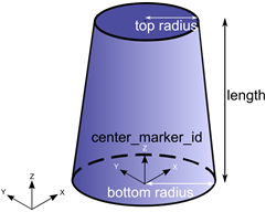 - ends_type = "BOTTOM_ONLY"の場合、CylinderまたはFrustumのBOTTOM端部のみが開いています。注: メッシュベースの接触モデルでCylinderまたはFrustumグラフィックを使用する場合は、ends_typeをCLOSEDに設定し、CylinderまたはFrustumグラフィックが閉じた状態になるようにしてください。MotionSolveのメッシュベースの接触では、形状が閉じている必要があります。詳細については、MotionSolveユーザーズガイドのMotionSolve user guide -> analysis tips -> best practice for running 3d contact models in motionviewMotionSolveをご参照ください。