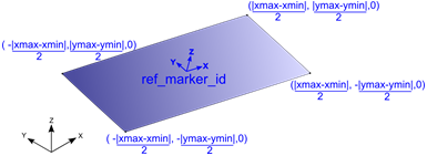 Planeグラフィックタイプは、空間範囲(xmin、xmax、ymin、ymax)とマーカーによって定義されます。このマーカーは、平面の中心に配置され、このマーカーのZ軸によって平面の垂線が決まります。空間長さはref_marker_idの座標系(上の図に青で表示)で定義されます。