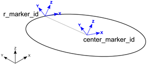 CircleFromRMグラフィックタイプは、2つのマーカーで定義されます。円の原点は、center_marker_idで指定されるマーカーの原点に置かれ、このマーカーのZ軸がこの円の平面の垂線を決定します。r_marker_idの原点を使用して、円の半径を として特定します。ここで、 はcenter_marker_idの位置、 はr_marker_idの位置です。