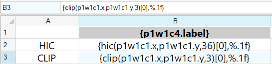 セルをクリックすると、そのセルと内容がEditバーに表示され、テキストまたは Templex式を編集できます。Editツールをもう一度クリックすると、Editバーが非表示になります。図 2. セルB3が選択され、セルがハイライトされ、内容がEditバーに表示される。