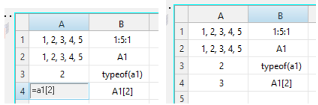 “=typeof (A1)”によって、セルA1の内容がベクトルであることを意味する“w 2”が表示されます。 - セルA4の式