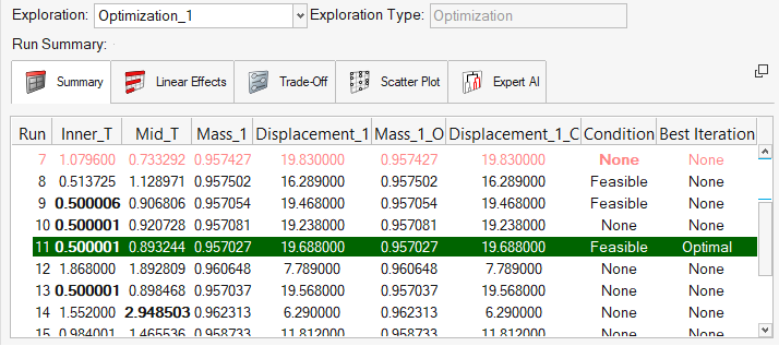 Summary Tableを確認します。ここには、最適化の各実行の入力、目的関数、および制約の値が示されます。