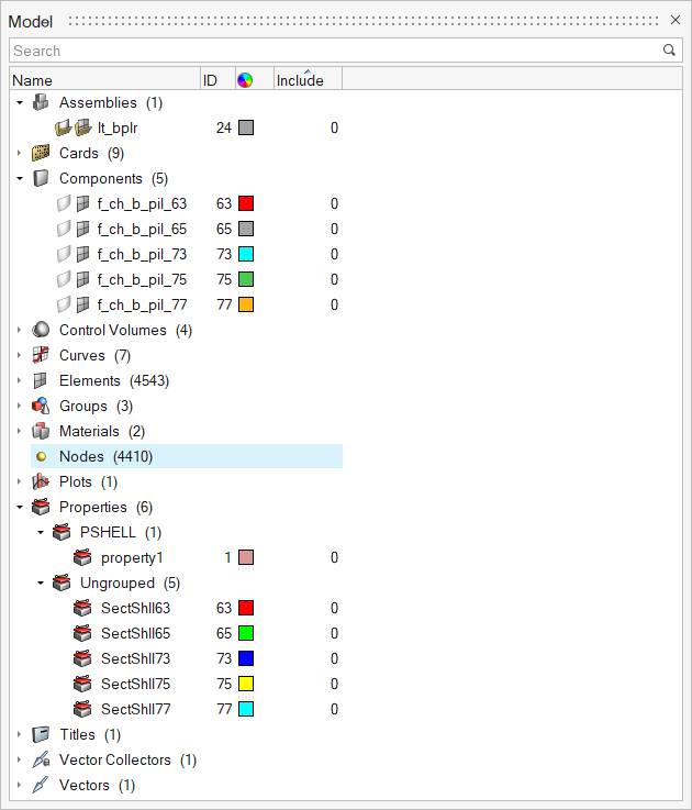 ブラウザは、情報をTreeviewで表示します。Treeviewには、componentsやgroupsなどのコレクターが最上階層に表示され、elementsやsurfacesなどのコレクター内に集められたエンティティが、その下に更に階層化された“子”として表示されます。Treeview内の各アイテムは、親ノードか子ノードかにかかわらず、通常は“ノード”と称されます。