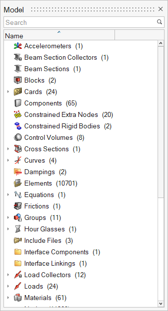 モデルブラウザは、セッションに存在するモデルのすべての内容を表示します。節点、要素、コネクター、ジオメトリ、荷重、サブシステムなどのエンティティが、コンポーネント、プロパティ、材料などの他のエンティティとともに表示されます。