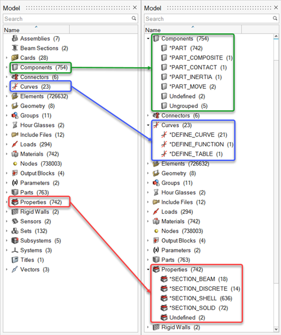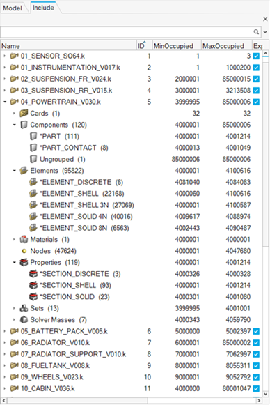 モデルブラウザのインクルードビューには、インクルードファイルに基づいたモデルの内容が、節点数と要素数とともに表示されます。インクルードビューには、インクルードファイルレベル、エンティティレベル、およびサブエンティティレベルでの使用されている最小および最大IDも表示されます。使用されているIDの最小値と最大値の列は、モデル内容表示ビューでもオプションでオンにすることができます。図 3.