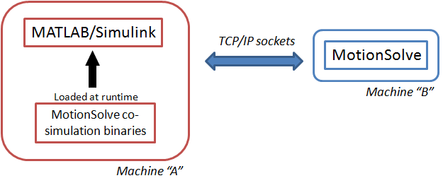 Simulinkから連成シミュレーションを開始する際、いくつかのMotionSolveバイナリファイルがSimulinkにより読み込まれます。このためには、Simulinkが存在するマシン上にMotionSolveが追加インストールされている必要があります。また、このMotionSolveのインストレーションは、Simulinkと同じプラットフォームタイプでなければなりません。例えば、Linux上のSimulinkとWindows上のMotionSolveとの間でIPC連成シミュレーションを行うには、Simulinkソフトウェアがインストールされている同じマシンにMotionSolve Linuxバージョンが必要になります。