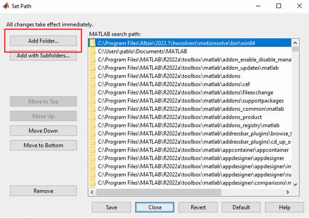 連成シミュレーションを生成するSimulink内の中核的機能は、S-Function(System Function)ブロックです。このブロックは、その挙動を定義するためにS-Functionライブラリ(動的に読み込まれるライブラリ)を必要とします。MotionSolveによってこのライブラリが提供されますが、S-Function側でこのライブラリを検出できる必要があります。MATLAB/SimulinkがS-Functionを検出するのを助けるために、ユーザーは、MATLAB/Simulinkがライブラリの検索に使用するパスのリストにS-Functionの場所を追加する必要があります。