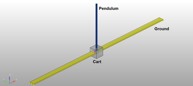カート上に搭載された倒立振り子について考えてみます。振り子はその底部で、回転ジョイントによってカートに拘束されています。カートはX方向にのみ自由に並進します。振り子には初期回転速度が指定されており、それによって底部を中心に回転します。