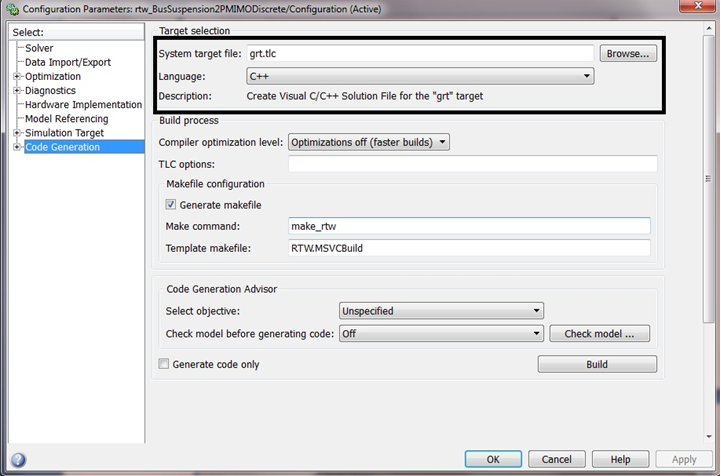 ここで、BrowseをクリックしてSystem target fileを変更し、"grt.tlc - Create Visual C/C++ Solution File for the