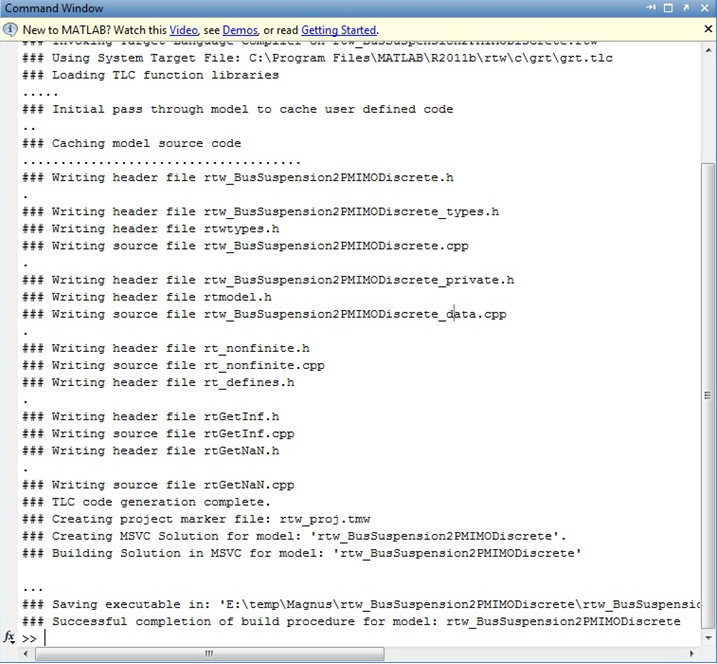 下に示すものに似ていて、### Successful completion of Real-Time Workshop build procedure for model: rtw_BusSuspension2PMIMODiscreteで終わる