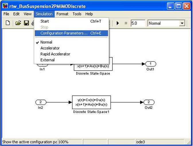 - Simulinkでrtw_BusSuspension2PMIMODiscrete.mdlを開きます。