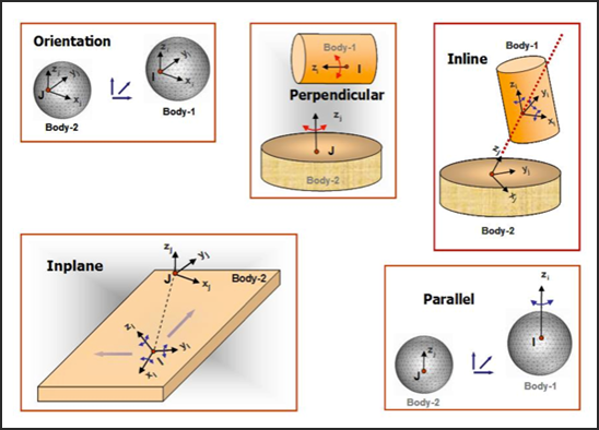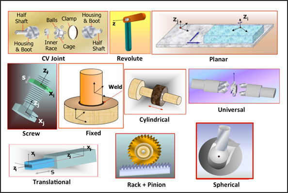 - 低次ペア標準ジョイント: 図 1 は、一般的に使用されるジョイントをいくつか示しています。物理的に、ロワーペアジョイントは、特定の方向のみの相対的並進および / または回転運動が可能な2つのあわせ面から成ります。これらの面は取り去られ、その関係性は、2つのボディ上の方向とポイント間の代数方程式のセットとして表されます。