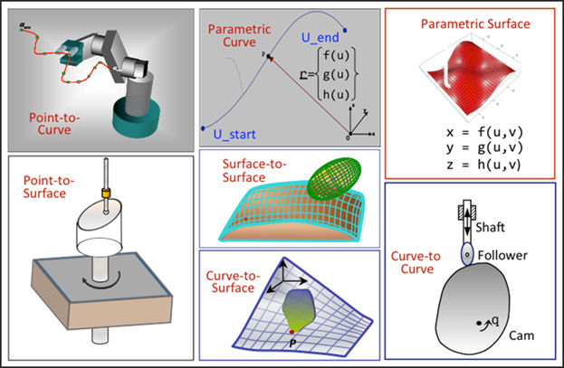 - ハイペアジョイント: 曲線と面を含んだ拘束。ハイペアジョイント拘束の例としては、点-曲線、曲線-曲線、曲線-面および面-面が挙げられます。曲線と面は通常、パラメトリックに定義されます。図 3に例を示します。